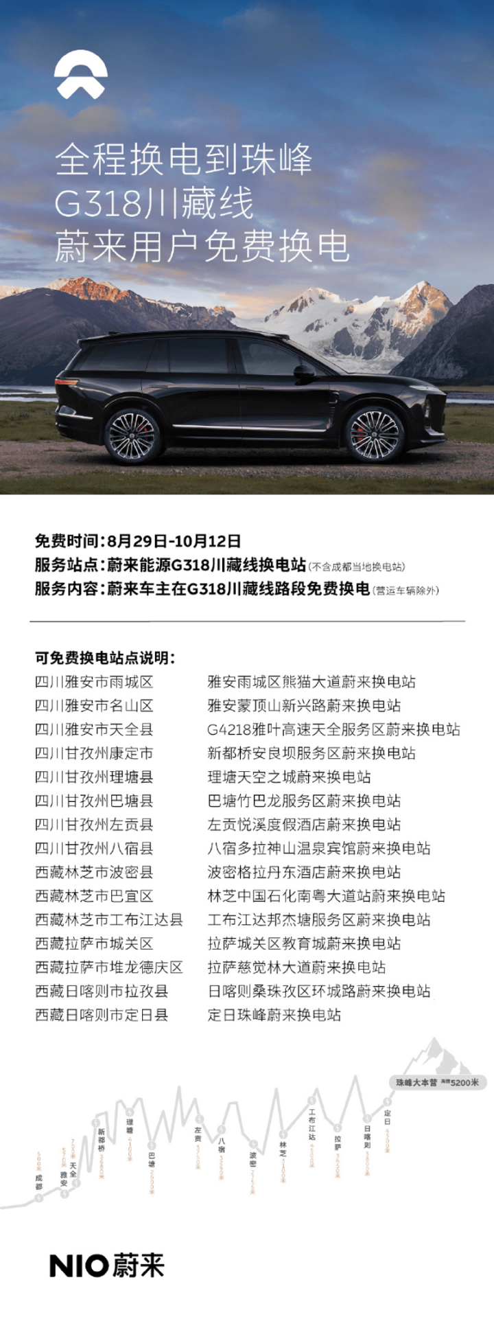 此前,蔚来能源G318川藏换电路线于8月16日正式贯通,全程2,950km,共布局15座换电站(乐道可用换电站13座),平均每200公里就有一座蔚来换电站,终点站为定日珠峰换电站。